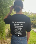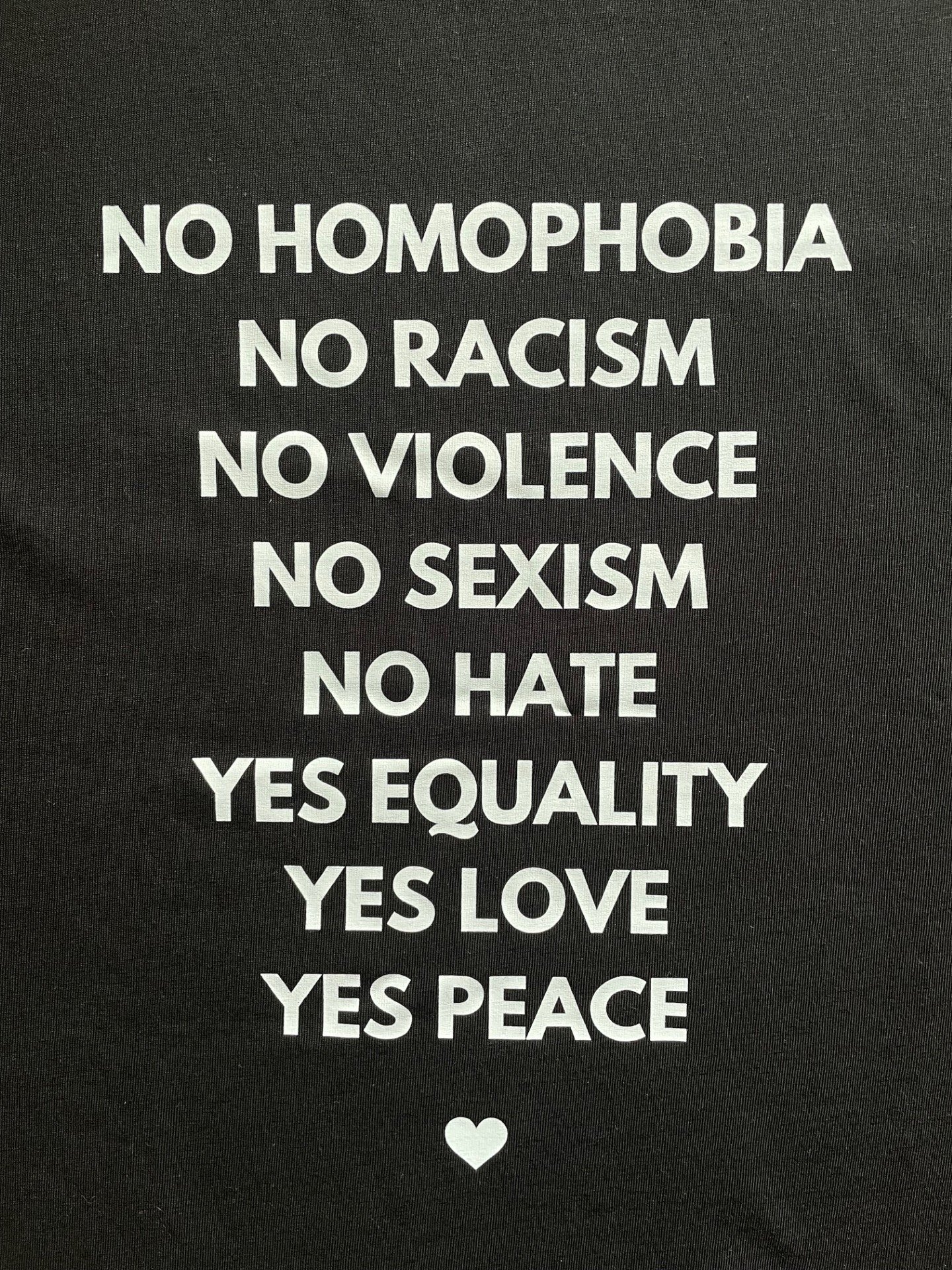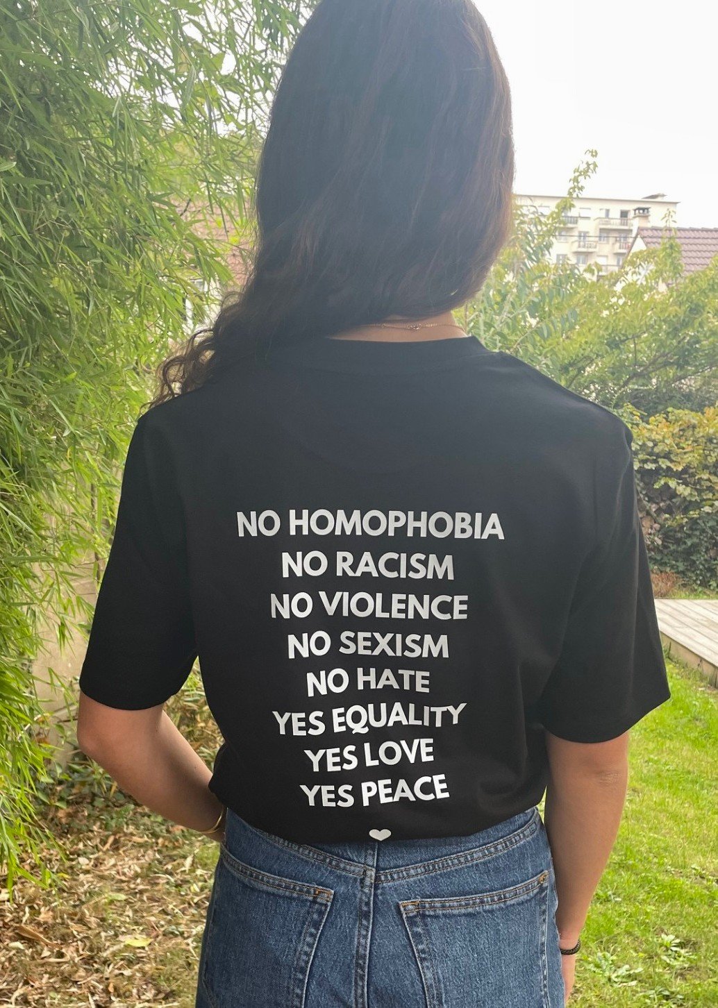 đCe T-shirt câest plus quâun vĂȘtement : câest une dĂ©claration. Un manifeste Ă  porter fiĂšrement, pour un monde sans homophobie, sans racisme, sans sexisme, sans violenceâ
